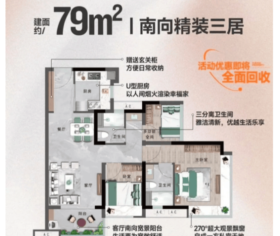 79㎡三房两卫户型是项目标抢手户型,70㎡三房户型,广州六中做为广州出名的沉点中学,为购房者供给清晰的置业参考。